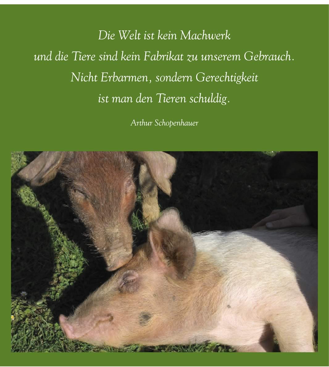 Eine möglichst artgerechte Haltung betrachten wir als unsere Pflicht. Dass dies in der Massentierhaltung nicht möglich ist, versteht sich von selbst. Für billiges Fleisch zahlen wir am Ende alle einen sehr hohen Preis. Die negativen Folgen für Mensch, Tier und Umwelt sind alarmierend. Ein Paradigmawechsel in der Agrarindustrie und in der Nutztierhaltung hin zu einer „Ethik des genug“ ist notwendig.